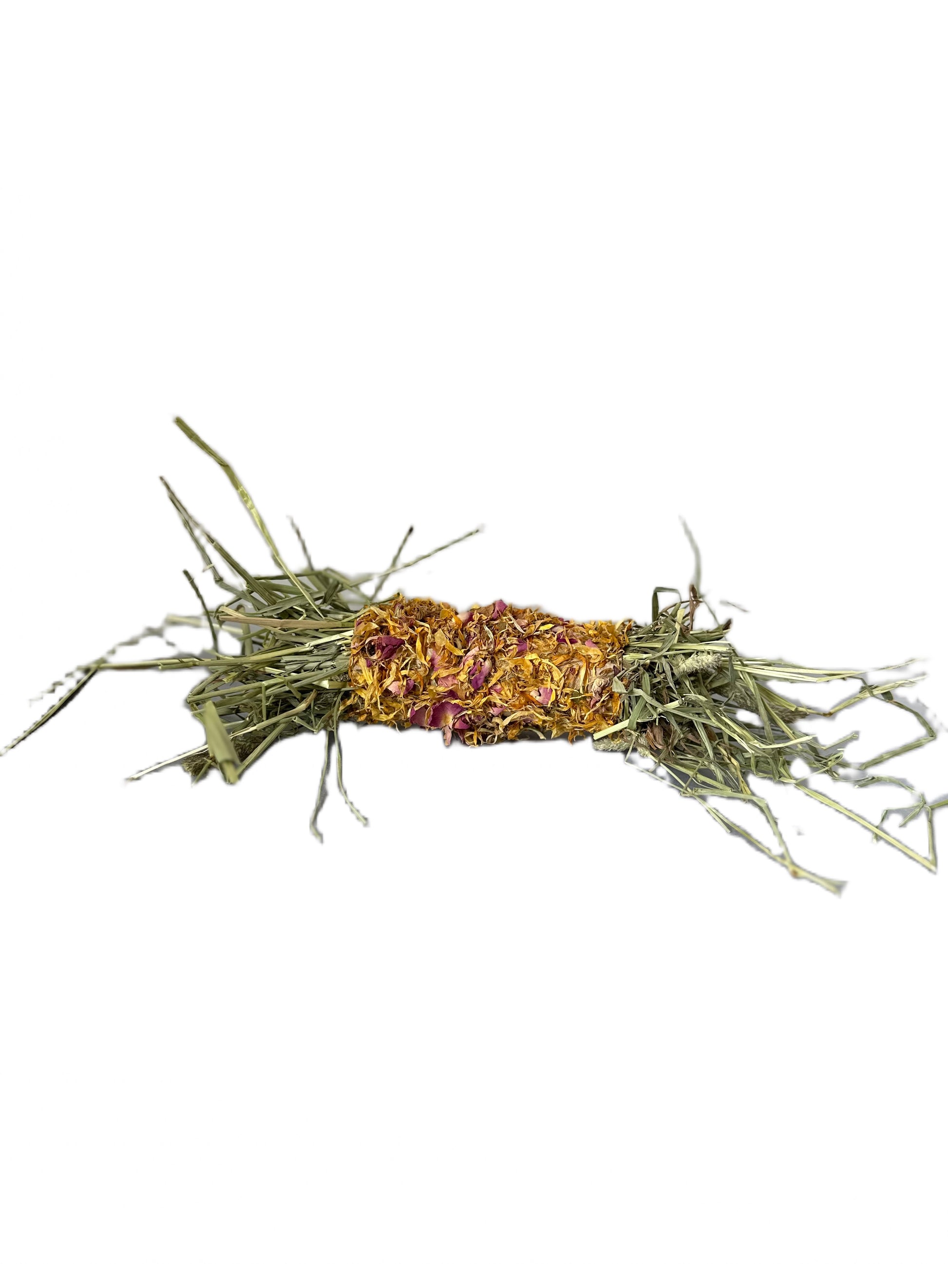 Vackra Blomsterrullen kombinerar timotejhö, papp, rosenblad, ringblomma och banan i en rullande tuggupplevelse. Med fyllning av blomblad inuti lockar den fram både nosande och gnagande beteende. Ca 20cm